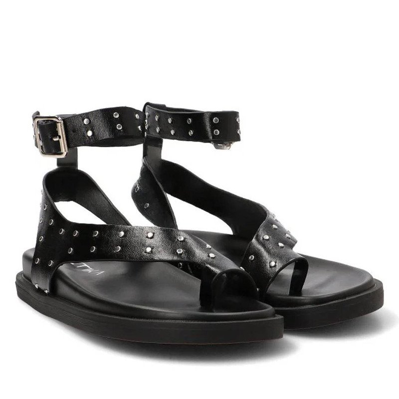 Sandalias planas Querol negras con tachulas y tiras al dedo y tobillo