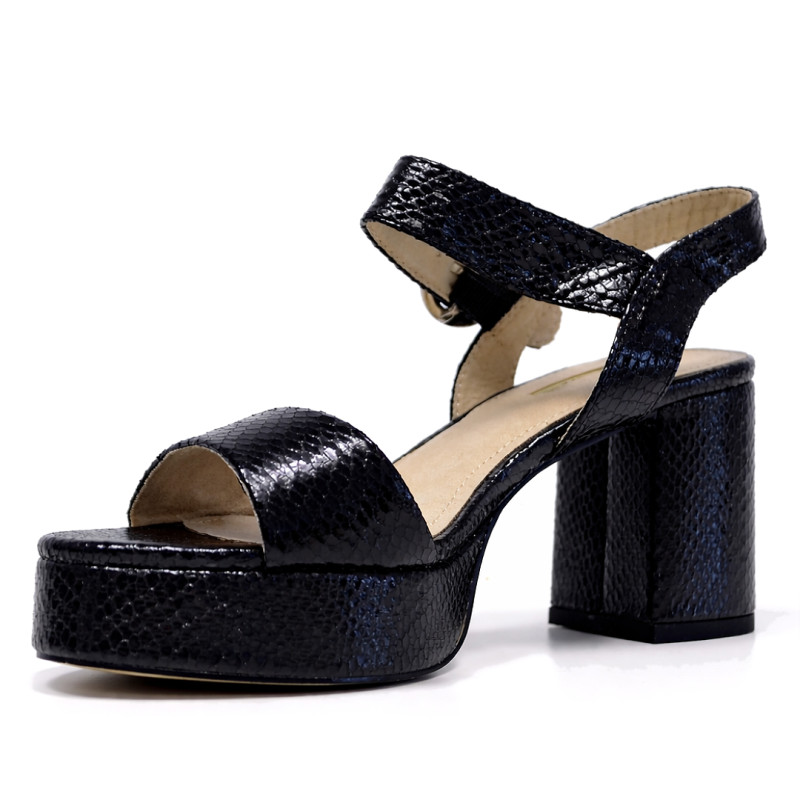 Sandalias tacón Querol negras efecto charol con textura de serpiente