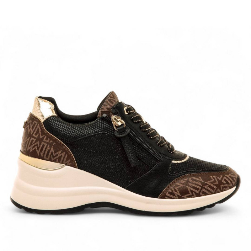 Las zapatillas negras de cuña Mariamare Cinzia para mujer destacan por su diseño urbano y moderno, perfecto para el uso diario. Este modelo combina diferentes texturas y tonos, incorporando detalles en color marrón con logotipo estampado y acentos dorados en el talón que aportan un toque sofisticado al conjunto. Su sistema de cierre mixto, formado por cordones y cremallera lateral, permite un ajuste rápido, cómodo y práctico para adaptarse al ritmo cotidiano. La cuña integrada ofrece una altura sutil que estiliza la figura sin renunciar a la comodidad, convirtiéndolas en una opción versátil y funcional para acompañar tus rutinas con estilo y un aire contemporáneo.
