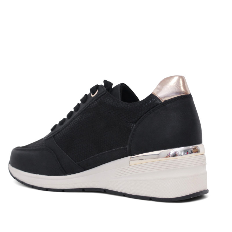 Zapatillas cuña para mujer Owel modelo Bastia en color negro, con cordones y cremallera lateral para un ajuste fácil y seguro. Destacan por su acabado efecto serpiente y panel trasero dorado, que aportan un toque sofisticado y moderno. Fabricadas en piel vegana, cuentan con cuña de altura media para estilizar la silueta sin sacrificar comodidad.