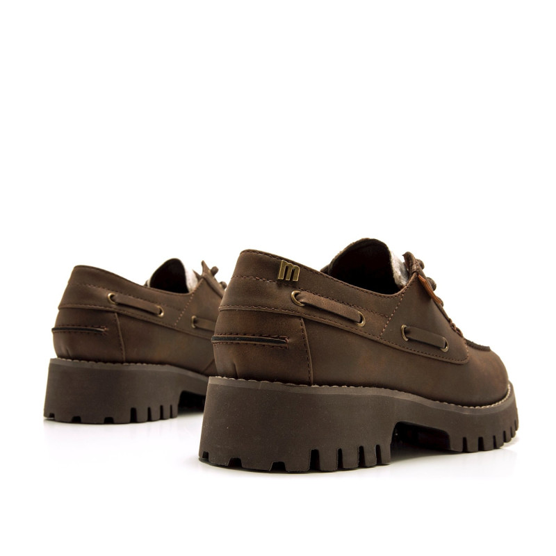 Zapatos de color moka para mujer de la marca Mtng, modelo Lenox. Con un diseño tipo náutico, destacan por su original acabado en la puntera con animal print de vaca. La suela gruesa y dentada aporta estabilidad y un toque moderno. Su cierre de cordon