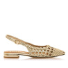 Zapatos planos destalonados de color champagne para mujer, modelo Nils de Mtng. Este modelo destaca por su diseño trenzado que combina frescura y estilo. La correa ajustable al tobillo con hebilla permite un ajuste cómodo, mientras que la punta en pi