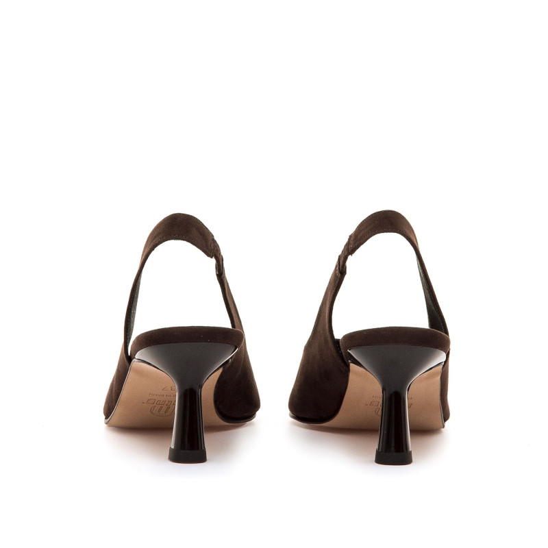 Zapatos de tacón tipo slingback de color marrón para mujer de la marca Mtng, modelo Ninette, con diseño destalonado y acabado brillante que añade un toque actual. La silueta afilada y el tacón medio fino con base cuadrada estilizan sin perder comodid