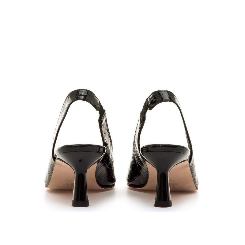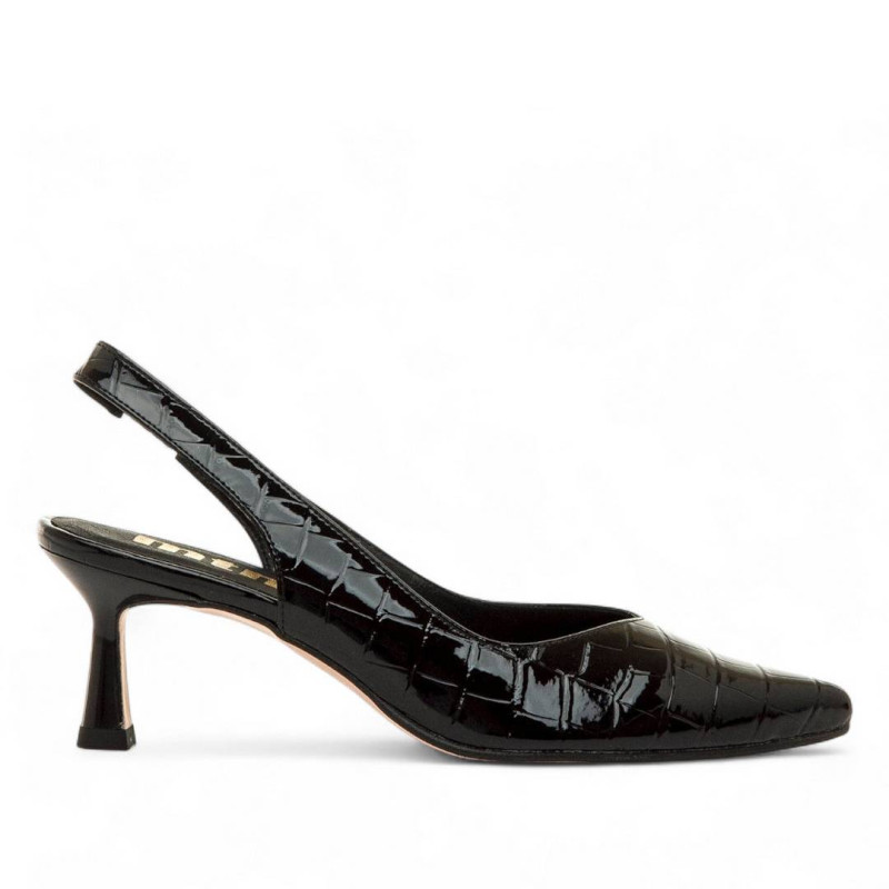 Zapatos de tacón negros para mujer de la marca Mtng, modelo Ninette de estilo slingback. Su acabado brillante con textura efecto cocodrilo aporta un toque actual y muy versátil, ideal para looks tanto formales como informales. El diseño abierto en el