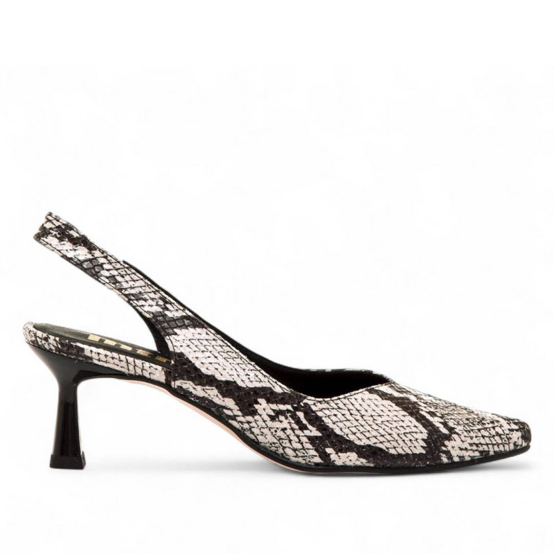 Zapatos de tacón destalonados de estampado animal para mujer de la marca Mtng, modelo Ninette, con diseño tipo slingback y acabado en print de serpiente de color blanco y negro. Su tacón medio fino con base cuadrada ofrece un extra de altura sin sacr